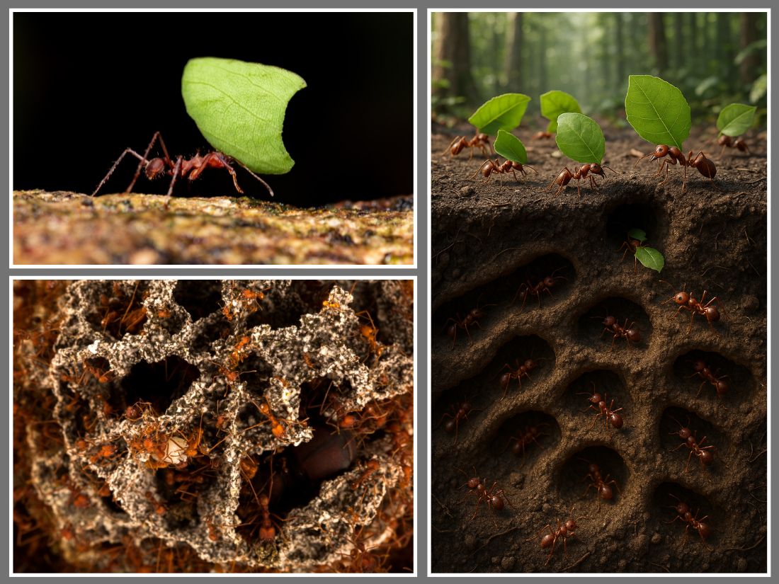 Certaines espèces tropicales, comme les fourmis coupe-feuille (Atta), construisent des structures souterraines comparables à de petites villes, où des millions d’individus coopèrent. Les ouvrières travaillent en synergie, sans coordination centrale, mais selon des signaux chimiques appelés phéromones, qui agissent comme une carte dynamique.